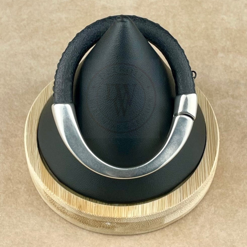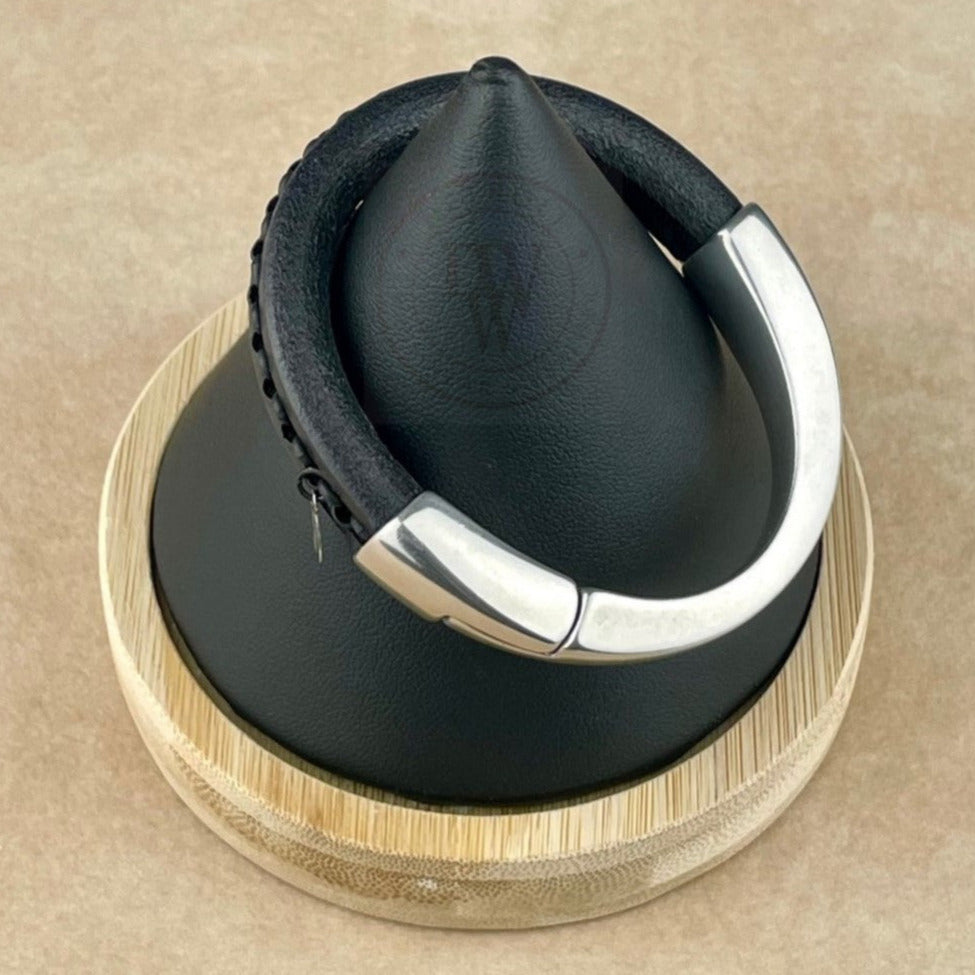 Black leather Arena bracelet with a silver clasp on a wrist with a blurred background. Arena bracelet lifestyle photo.