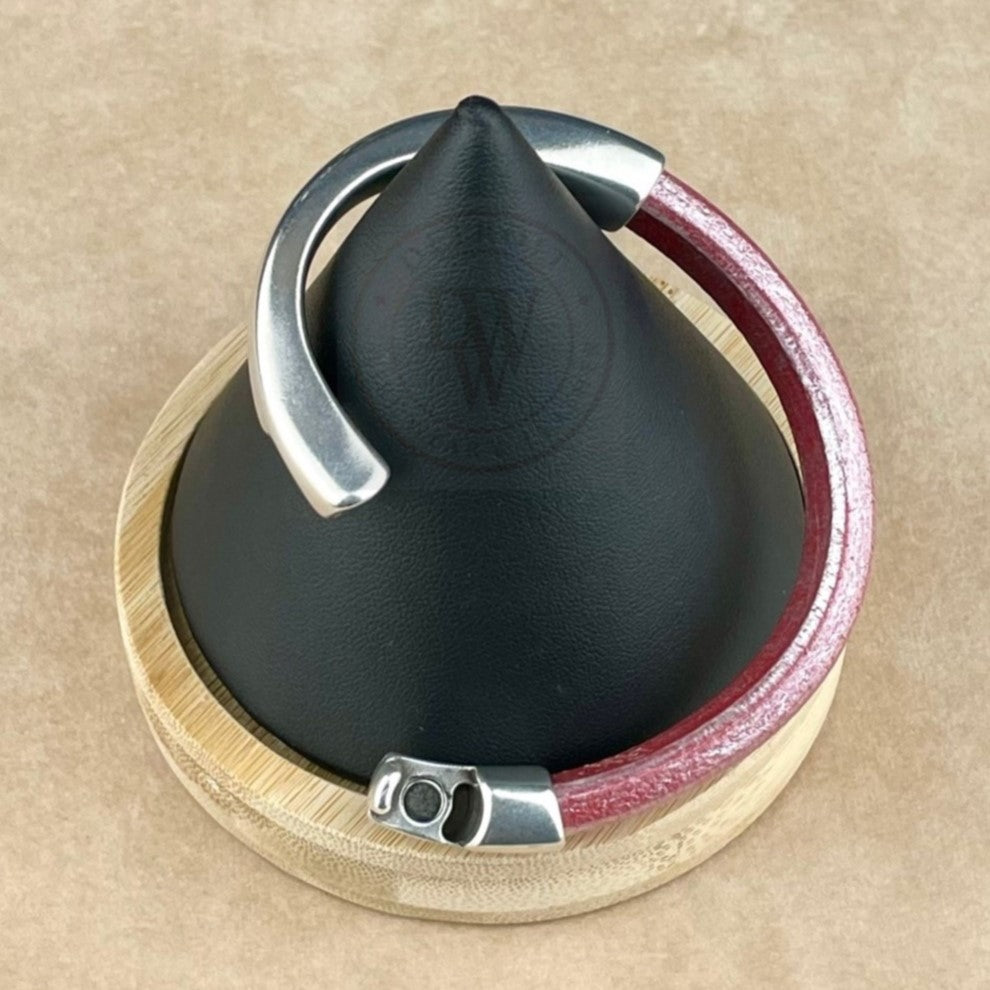 A close-up of a wrist wearing a rust colored leather bracelet with a silver clasp on a textured surface. Arena bracelet lifestyle photo.