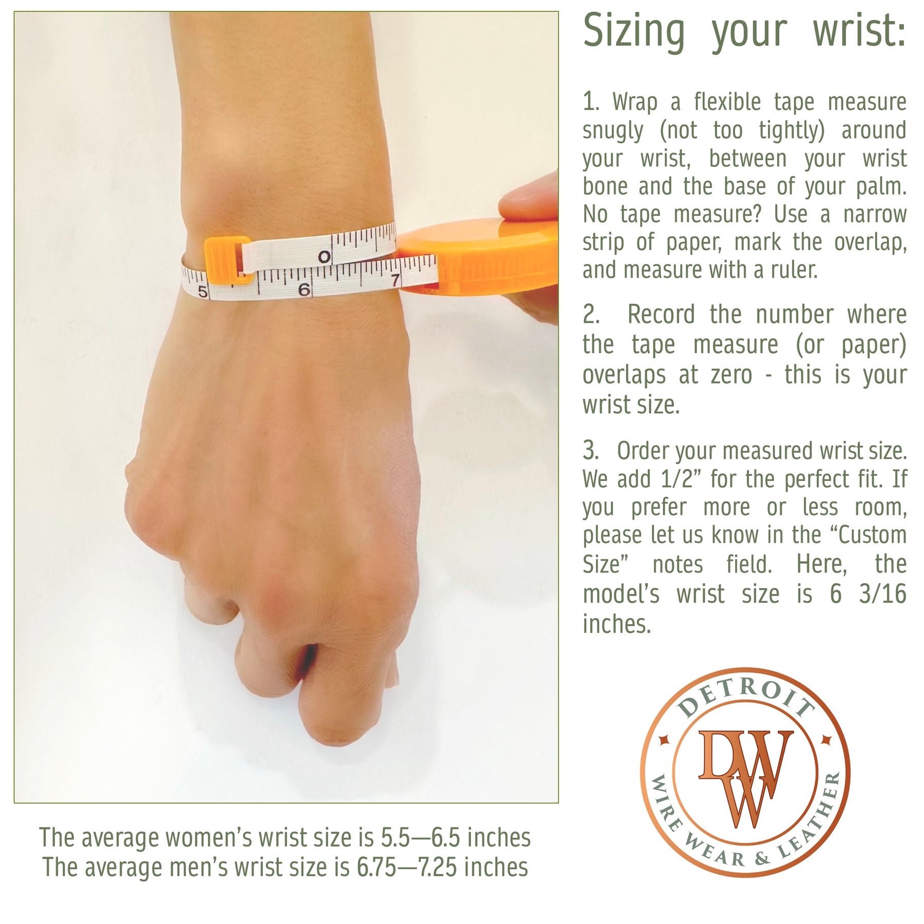 3.  Order your measured wrist size. We add 1/2” for the perfect fit. If you prefer more or less room, please let us know in the “Custom Size” notes field. The model’s wrist size is 6 3/16".