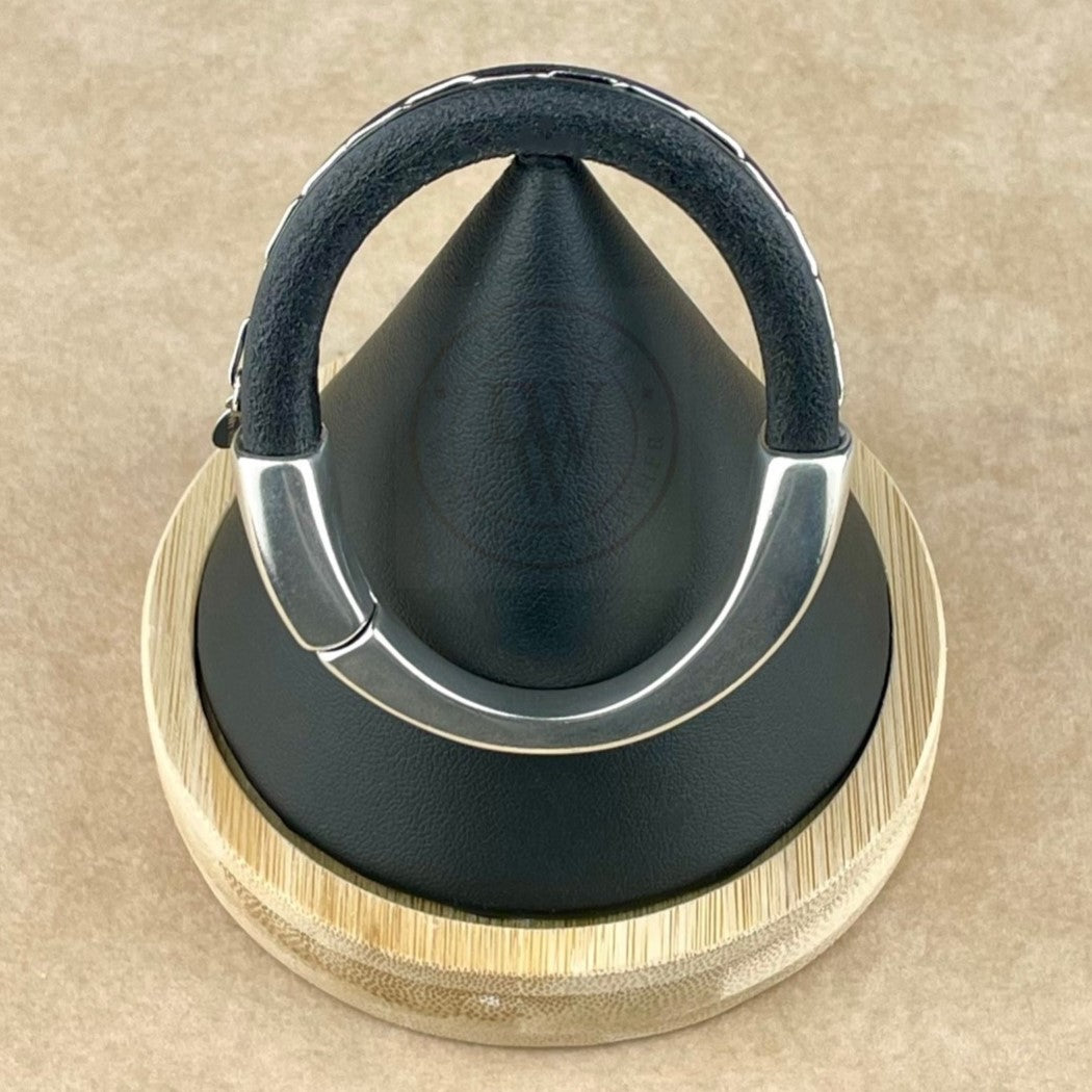 This unisex bracelet features a sleek black leather band adorned with a delicate rhodium chain for a refined yet edgy look. The bracelet is secured with a long, arcing, antique silver magnetic clasp, ensuring easy wear and a seamless fit. The combination of textures—smooth leather, polished metal, and subtle chain detailing—creates a versatile piece that balances rugged charm with modern sophistication.