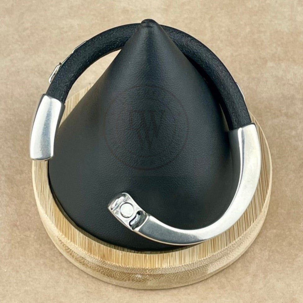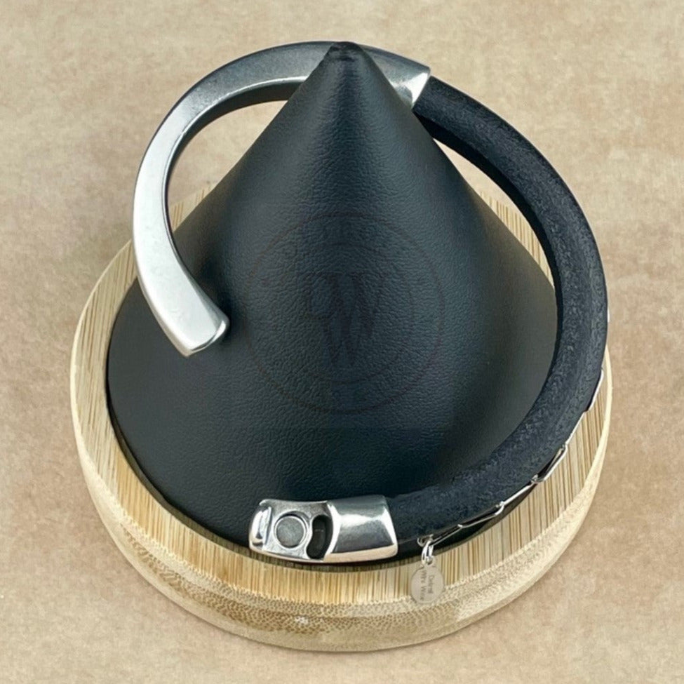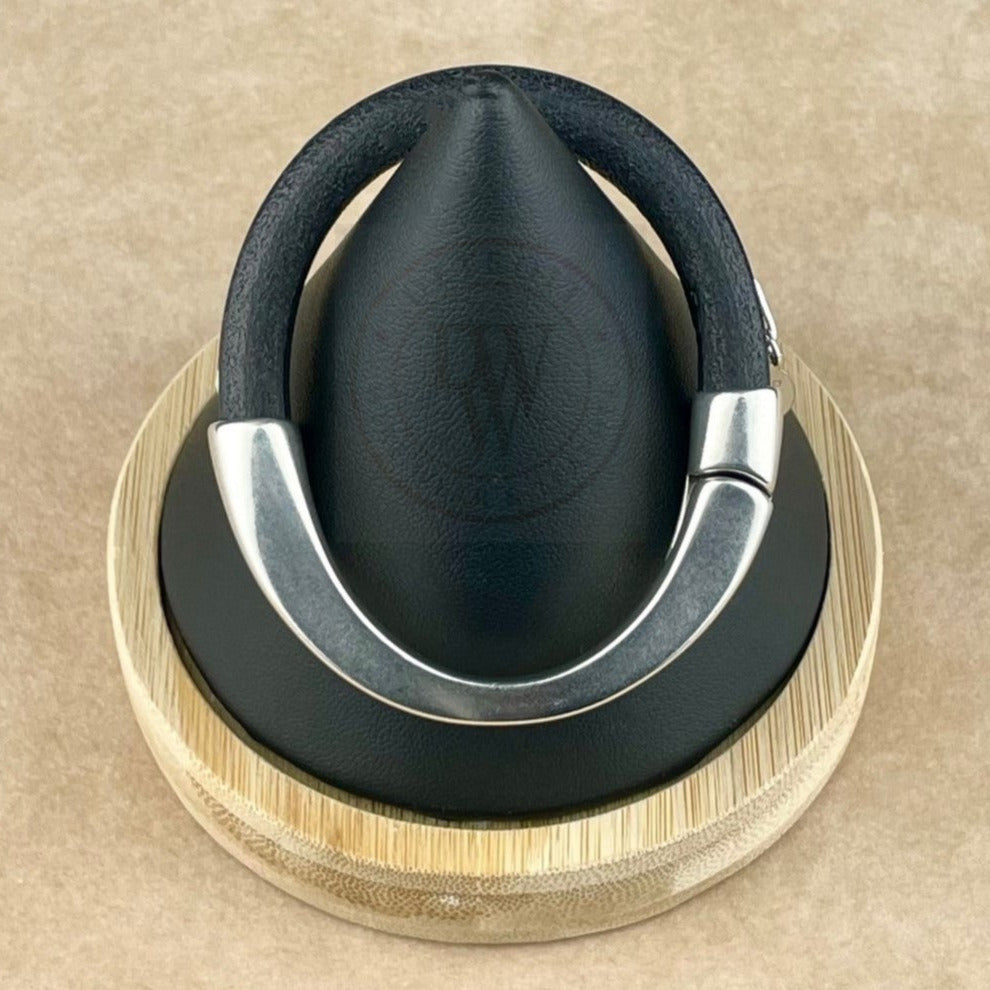Black leather Arena bracelet with a silver clasp on a wrist with a blurred background. Arena bracelet lifestyle photo.