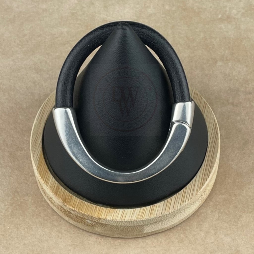 Black leather Arena bracelet with a silver clasp on a wrist with a blurred background. Arena bracelet lifestyle photo.